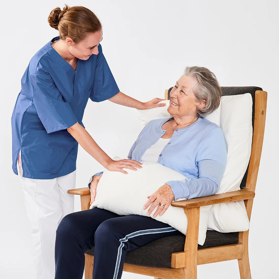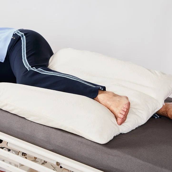 Använd den under benet eller båda benen, mellan benen eller under vaderna för att minska tryck mot hälarna. Den fungerar också som ett stabilt stöd för en arm. Vid ryggläge kan kudden placeras under ryggen eller mellan benen för att fördela trycket och avlasta utsatta områden. Vid sittande placeras den i ryggen som ett mjukt men stadigt stöd som kan bidra till en mer bekväm hållning.