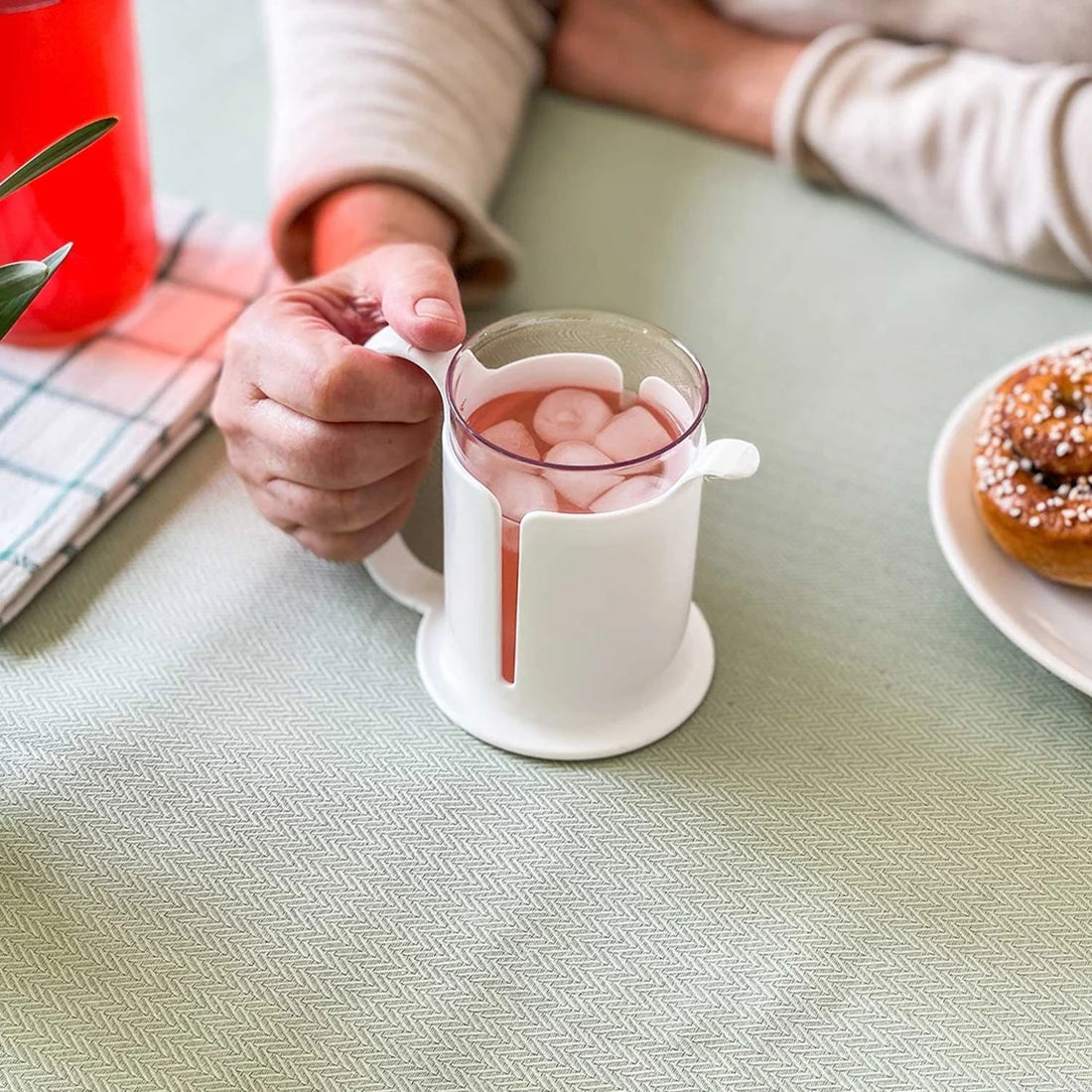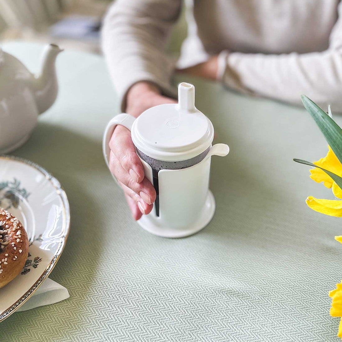 Denna lätta bägare kan användas till såväl kall saft som varm soppa och rymmer 3 dl. Den värmeisolerande hållaren tillåter både en- och tvåhandsfattning. Basen har gjorts extra bred för att förhindra att muggen tippar och bägaren kan enkelt lyftas ur hållaren innan maskindisk.
