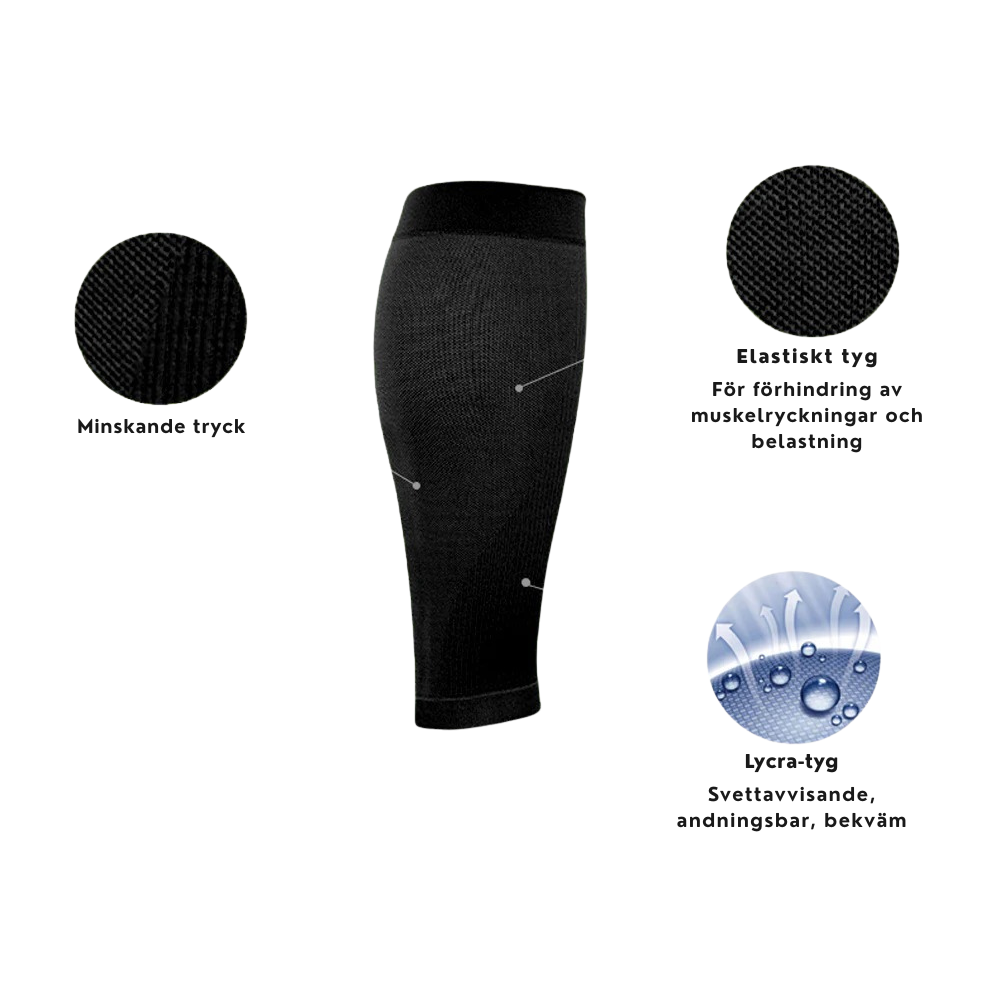 Kompressionsmaterialet ger ett gradvis tryck över vaden som stödjer musklerna och kan stimulera cirkulationen.