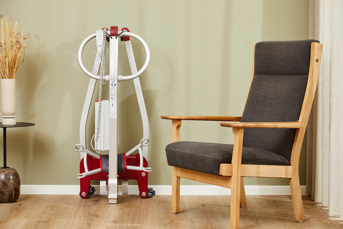 Lyften är utvecklad för säkra förflyttningar mellan säng, stol och rullstol och passar både brukare och vårdare.