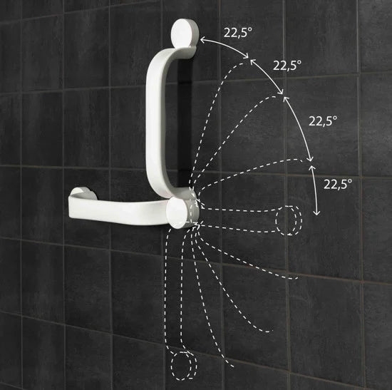 Stödhandtagets genomtänkta form och yta ger ett stadigt grepp även om händerna eller handtagen är blöta. Den triangulära formen och det tydliga tumgreppet förstärker tryggheten.