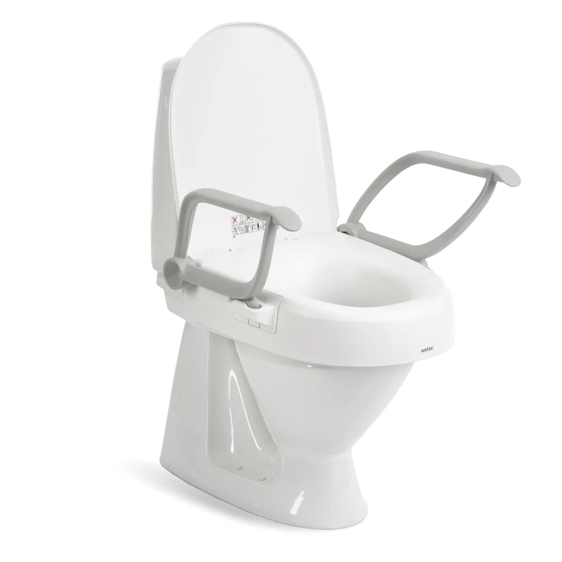 Etac Cloo finns i två modeller, med eller utan armstöd. Båda produkterna kan justeras i höjd och vinkel. De uppfällbara armstöden kan fixeras när extra stabilitet behövs. Cloo är helt enkelt en modern, säker och hygienisk toalettsitsförhöjare.